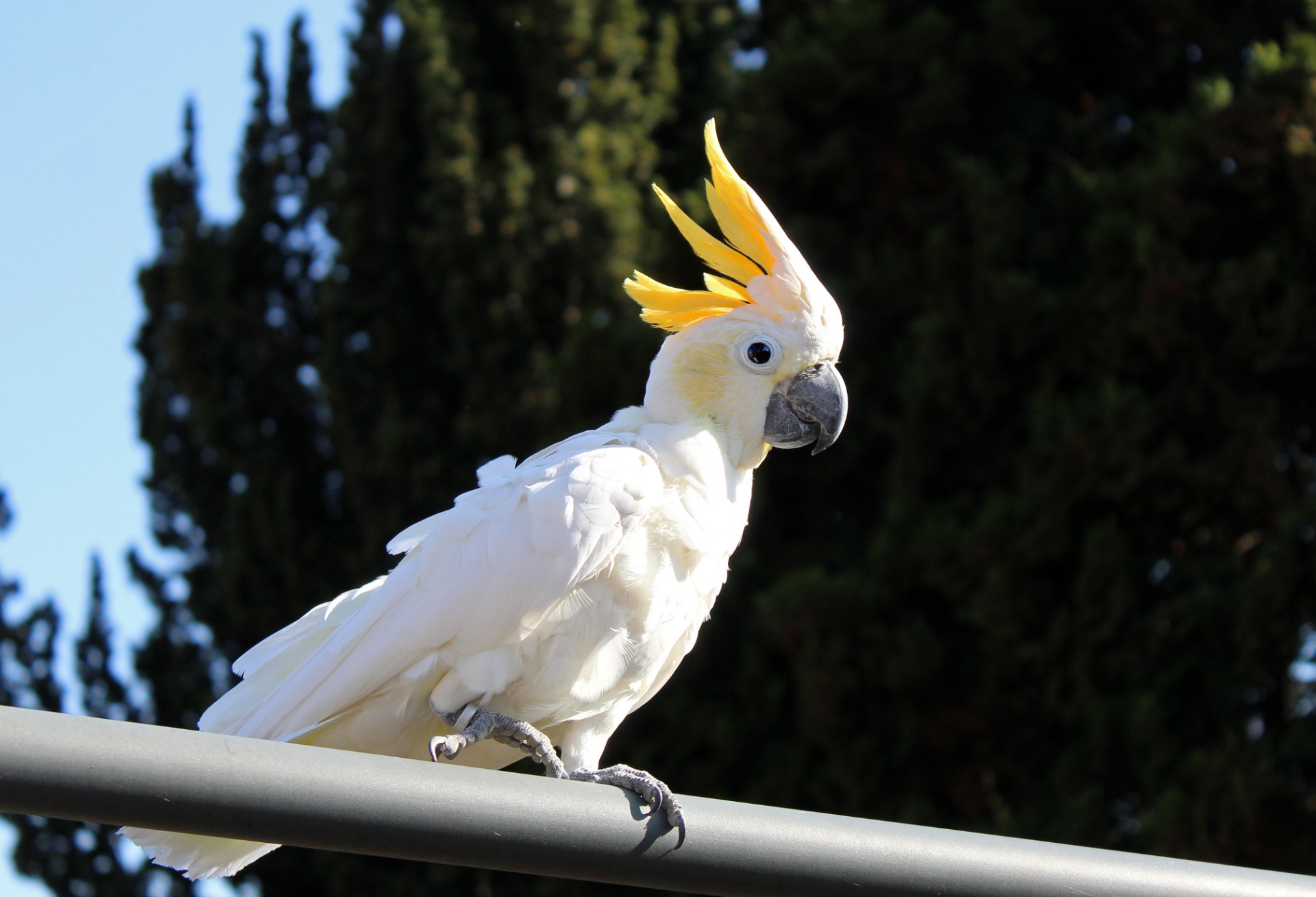 se o středně velkého bíle zbarveného papouška, který má dlouhou sytě žlutou až